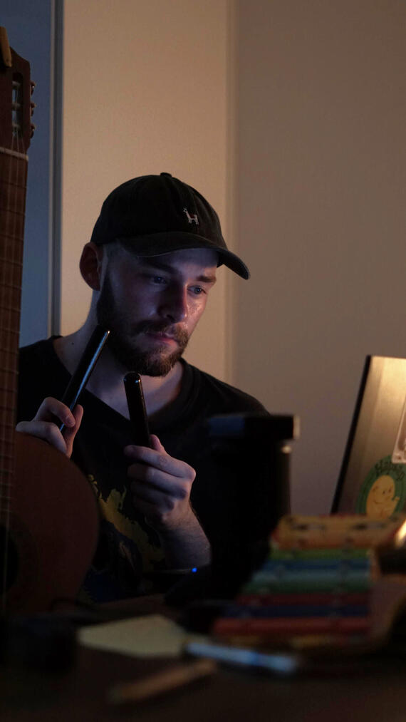 Ik speel gitaar, piano, ukulele, mondharmonica en kalimba.